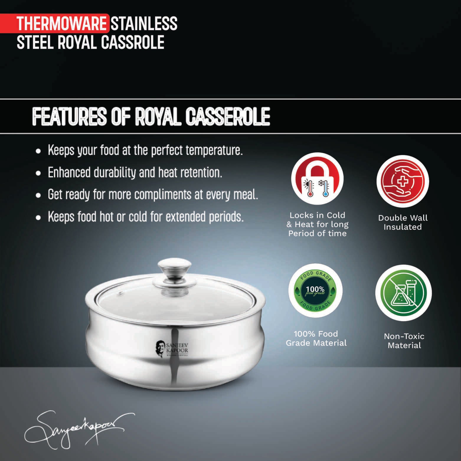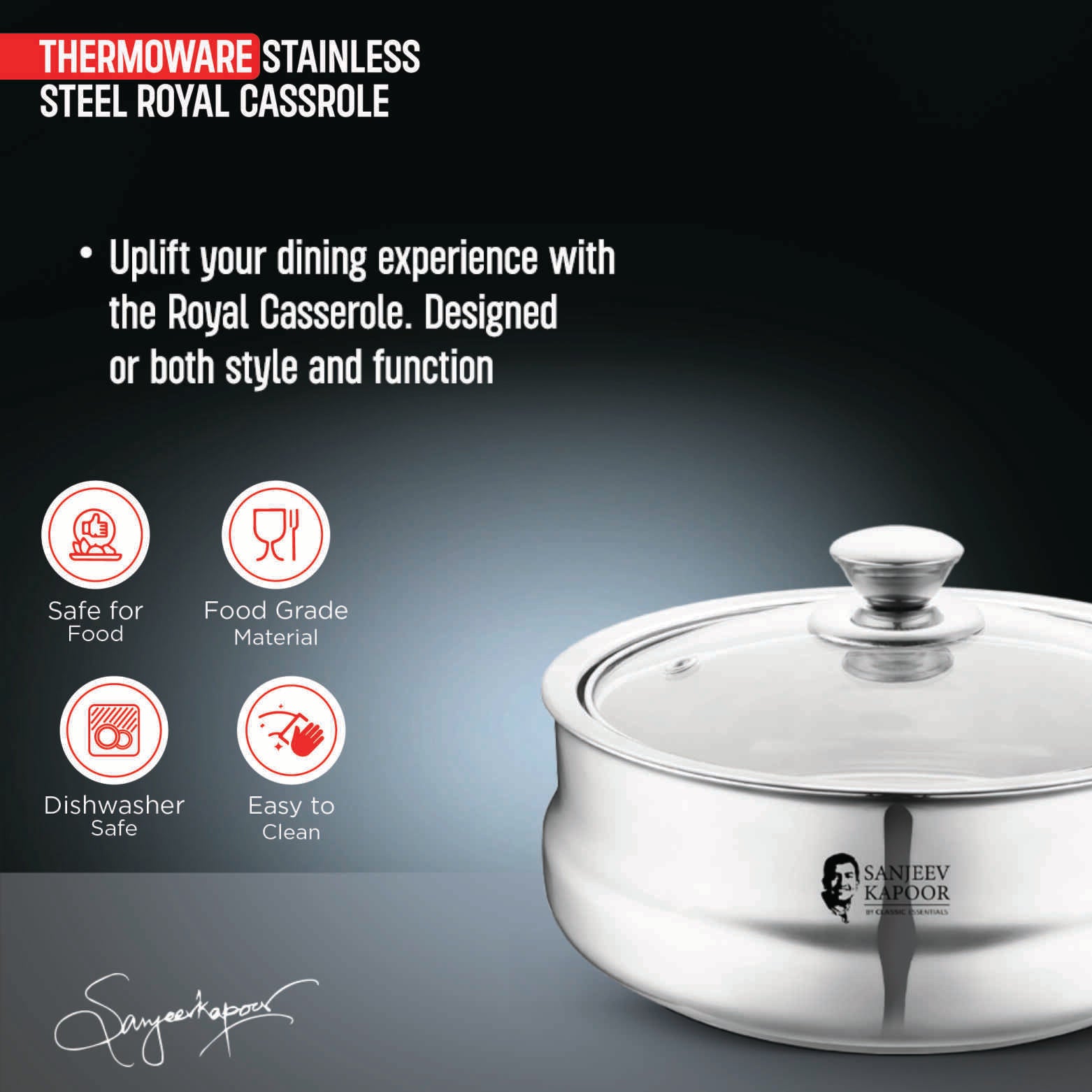 The Sanjeev Kapoor by Classic Essentials Royal Casserole is a true blend of elegance and performance. With superior insulation and a regal design, it keeps your dishes fresh and at the perfect serving temperature for longer, making it a centerpiece for any dining occasion.