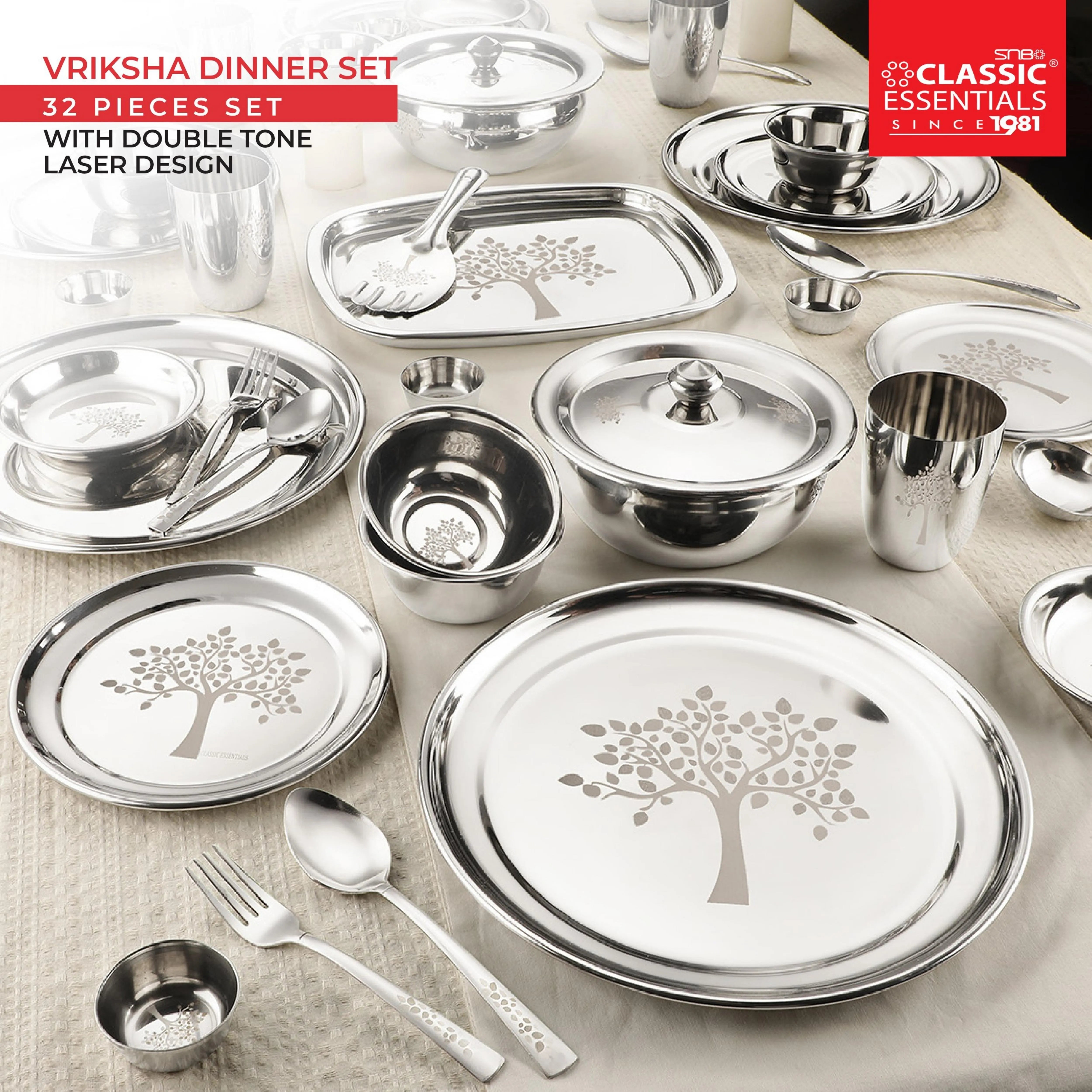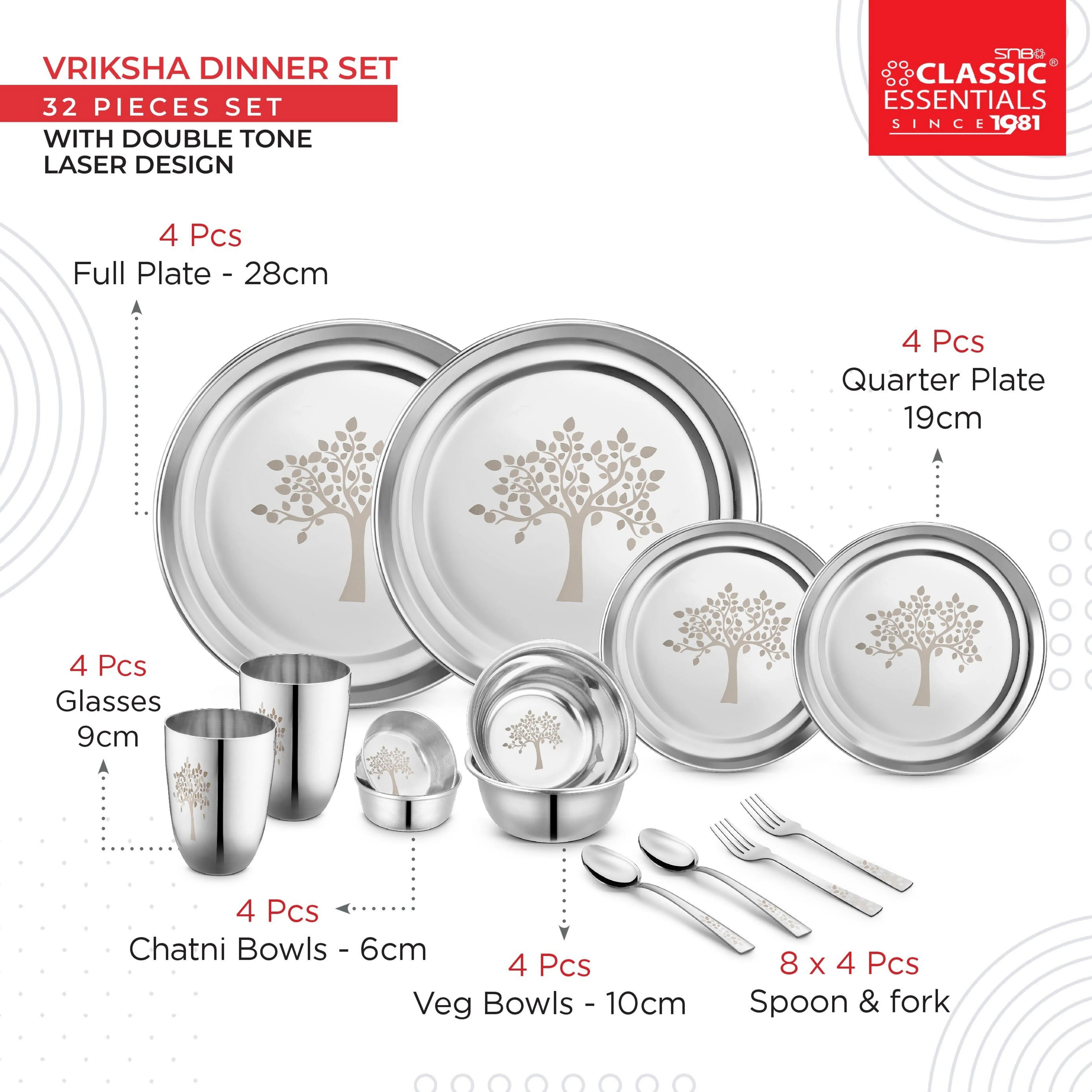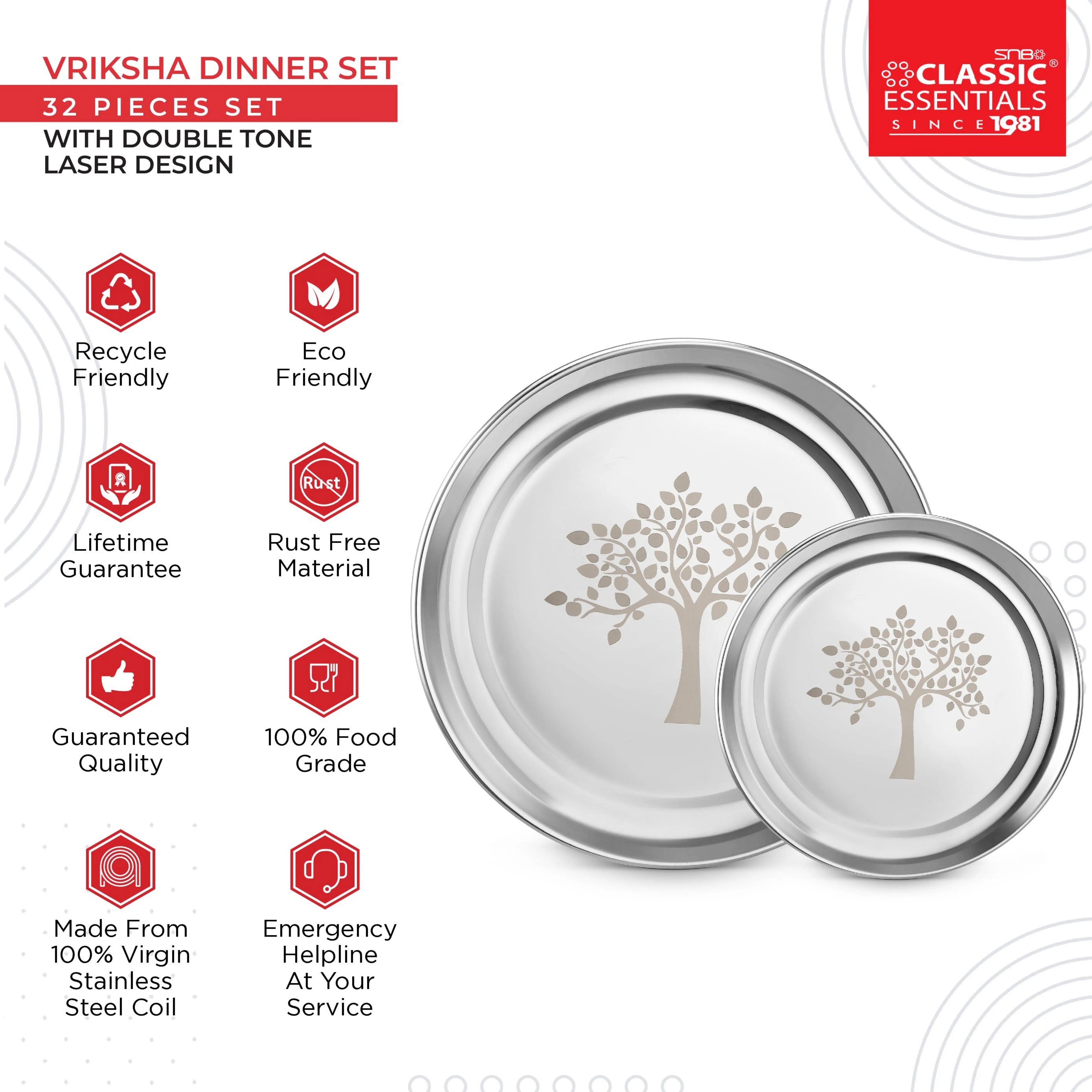 This steel 32 piece Vriksha dinner set is made from food-grade which makes it a brilliant product and an ultimate combo. The quality makes it a way healthier life than regular melamine products. This makes sure that it is toxin-free and there is no food contamination.