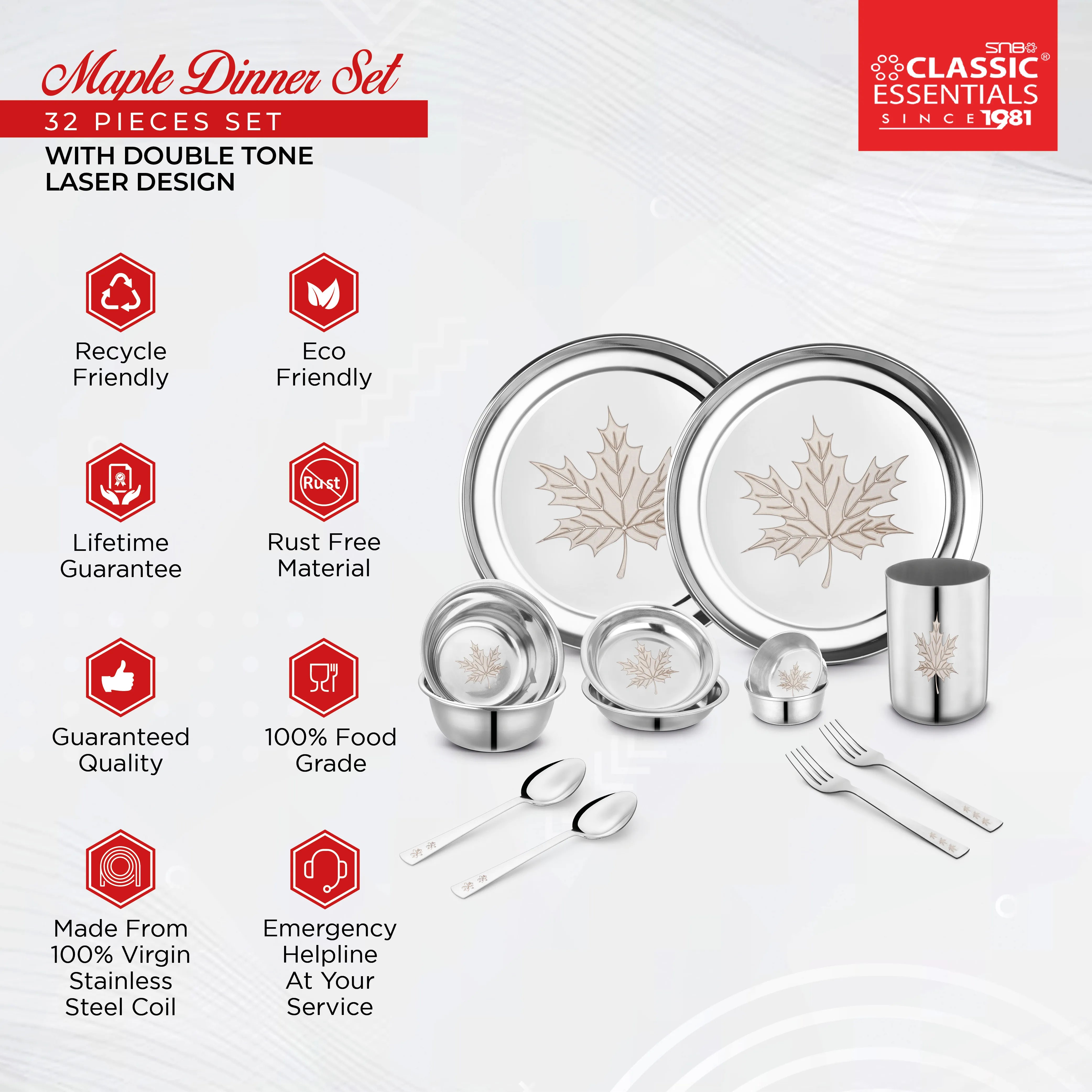 This steel 32 piece Maple dinner set is made from food-grade which makes it a brilliant product and an ultimate combo. The quality makes it a way healthier life than regular melamine products. This makes sure that it is toxin-free and there is no food contamination.